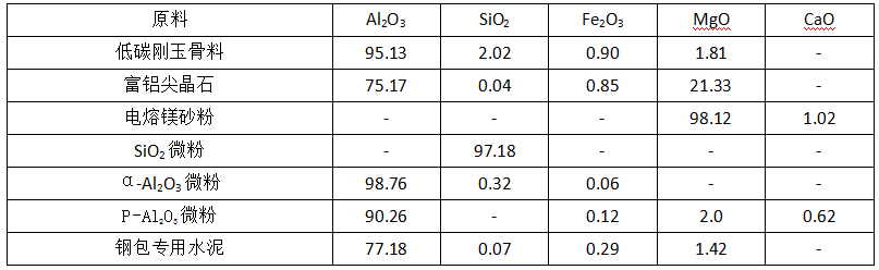 試驗采用低碳剛玉、鎂砂和富鋁尖晶石為主要原料,因材料要求具有優良的抗渣侵蝕性、抗渣滲透性和抗剝落性,所以采用超微粉和鋼包專用水泥結合。為滿足所需材料的各種理化性能指標,保證其使用效果,確定原料最佳的臨界粒度為8mm。試驗用各種原料及化學組成見表1,試驗用不同鋼廠精煉渣化學成分見表2,試樣的配料組成見表3。