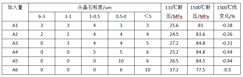 通過對同一組方中各尖晶石粒度加入量的改變,試樣在不同溫度處理后的性能指標見表4。