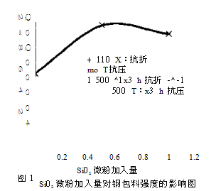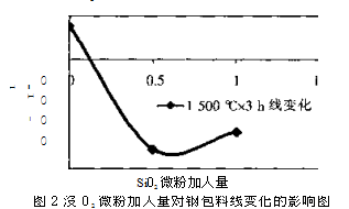 早期一般認為Si02微粉加入到澆注料中,能通過高溫在其表面形成一個致密層,達到增加抗渣的目的。而后有研究則認為Si02含量為0〜2.0%的澆注料,發現Si02微粉的加入不能抑制渣侵蝕,但增加了結構的耐剝落性。Si02微粉加入量>0.5%導致重燒線變化是負值。還有研究發現Si02微粉加入量為0.5%的澆注料,其高溫抗折強度急劇下降,而荷重軟化點卻基本上穩定;高溫抗折強度從沒加硅微粉的14 MPa減小到加入量為0.5%時的2MPa。在荷重軟化點的試驗中,在0.2MPa荷載下加熱到1660℃的熱膨脹對于沒加硅微粉的澆注料是正值,而對于加入0.5%硅微粉的澆注料則是負值。而且Al203-尖晶石澆注料的高溫抗折強度隨著溫度從1300℃上升到1500℃而不斷增加,而且比高鋁澆注料的還要高得多。但在我們所研究的剛玉-尖晶石體系的鋼包料中,其Si02微粉的加入量在此基礎上則要更加嚴格控制,否則其烘后、燒后性能指標會變化很大。Si02微粉對剛玉-尖晶石鋼包料物理性能的影響見圖1、圖2。