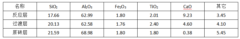 對試驗磚的反應層、過渡層、原磚層的變化進行了微現結構分析,包栝化學成分、巖相、電鏡、X-射線分析等。
