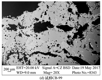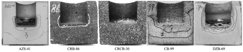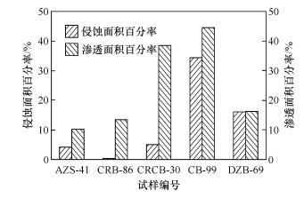 由圖2可以看出:AZS-41和CRB-86的侵蝕面積百分率和滲透面積百分率都很小,表明兩種制品的抗飛灰侵蝕性和滲透性均很好;CB-99的侵蝕面積百分率和滲透面積百分率都最大,表明其抗飛灰侵蝕性和抗飛灰滲透性均最差;DZB-69的侵蝕面積百分率和滲透面積百分率均介于AZS-41和CB-99之間,表明其抗飛灰侵蝕性和滲透性均介于AZS-41和CB-99之間;CRCB-30的侵蝕面積百分率與AZS-41的相近,但其滲透面積百分率則與CB-99的相近,這表明CRCB-30的抗飛灰侵蝕性很好,但抗飛灰滲透性很差。歸納起來,各試驗(yàn)磚的抗飛灰侵蝕性由好到差的排列順序?yàn)镃RB-86>AZS-41>CRCB-30>DZB-69>CB-99,而抗飛灰滲透性由好到差的排列順序?yàn)锳ZS-41>CRB-86>DZB-69>CRCB-30>CB-99。