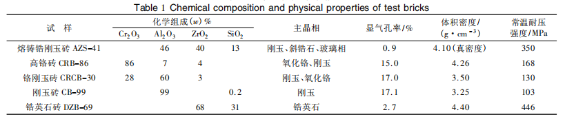 所用試驗(yàn)磚及其理化性能指標(biāo)見表1。除熔鑄鋯剛玉磚AZS-41為某公司飛灰熔融爐襯磚外,其他均為中鋼集團(tuán)洛陽耐火材料研究院有限公司產(chǎn)品。