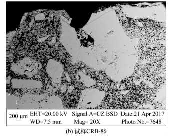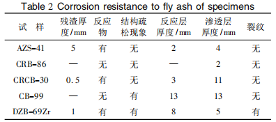 結(jié)合圖1和表2可以看出:坩堝AZS-41內(nèi)有5mm厚的殘余熔融飛灰,且有大量析出物存在,說明其抗飛灰滲透性好,但抗飛灰侵蝕性較差;坩堝CRB-86內(nèi)表面和底部的反應(yīng)跡象不明顯,滲透層厚度僅為2 mm,具有很好的抗飛灰侵蝕性和抗飛灰滲透性;坩堝CRCB-30內(nèi)殘余0.5mm厚的熔融飛灰,被輕微侵蝕,反應(yīng)層和滲透層厚度分別為3和11mm,具有良好的抗飛灰侵蝕性,但抗飛灰滲透性差;坩堝CB-99內(nèi)飛灰全部滲入坩堝,坩堝被嚴(yán)重熔蝕,骨料呈孤立狀,侵蝕層和滲透層厚度均達(dá)到13 mm,其抗飛灰侵蝕性和抗飛灰滲透性極差;坩堝DZB-69內(nèi)有少量熔融飛灰殘余,坩堝熔蝕嚴(yán)重,結(jié)構(gòu)疏松,反應(yīng)層和滲透層厚度分別為8和5mm,抗飛灰滲透性較好,但抗飛灰侵蝕性較差。