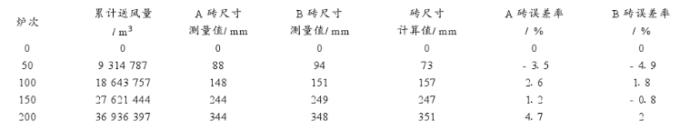 每一爐期結束后剩余磚情況大致如下:A磚平均殘留95 mm以上,B磚平均殘留90 mm以上(具體見表2)A磚殘留尺寸起伏較大,最長與最短殘磚尺寸差190 mm左右;B磚殘留磚尺寸起伏也大,最大與最小殘磚尺寸差170mm左右。從消耗來看,A磚約1.6 mm/爐次,B磚約1. 65mm/爐次。