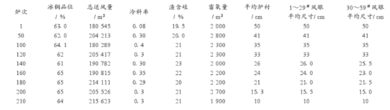 (1)嚴格控制操作參數:各操作參數盡量控制在目標值內,如S期單位送風量目標值38000〜40000 m3/h;B期單位送風量目標值42000〜44000 m3/h;渣含硅目標值基本上控制在21% ± 1 %;冷料率目標值為0. 30% ±0.05 %,平衡爐溫,實際操作中要求根據冰銅品位進行調整。