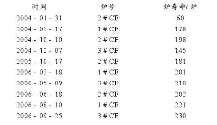 具體爐壽命情況比較見表1。