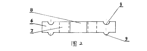 圖1、2中,6—專用異型耐火磚的整體,7-異型磚整體6上的中心通孔,8—異型磚整體6外側(cè)面的凹槽、凸起,9—異型磚整體6上、下表面的凹槽、凸起。本實(shí)例在使用時(shí)可由數(shù)個(gè)專用異型磚的整休6通過(guò)其外側(cè)面的凹糟、凸起8相亙咬合物成導(dǎo)風(fēng) 墻4 (附圖3中)的一層,再由若干專用異型磚的整體6通過(guò)其上、下表面的凹槽、凸起相互4合砌成導(dǎo)風(fēng)墻4 (附圖3中)的若干層,這樣就徹筑成有數(shù)個(gè)導(dǎo)風(fēng)孔的堅(jiān)爐導(dǎo)風(fēng)墻。
