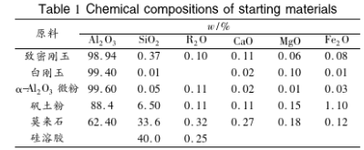煉鋼廠所用澆注料大多數為水泥及低水泥結合高鋁澆注料。這些澆注料成型固化后一般還需養護2~3d,拆模后一般還需烘爐7d。為了追求高爐的高效化與長壽化,需要對爐體進行熱態修補,這是水泥、樹脂和焦油結合材料都無法滿足的,因為水泥結合材料需要足夠的水分和養護時間才能有良好的使用性能,而樹脂和焦油結合材料在熱態施工過程中產生有害氣體。為此,以硅溶膠為結合劑研制了高爐熱態修補用剛玉—莫來石快干澆注料