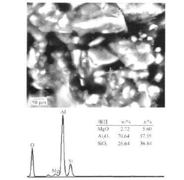 可以看出:1100 °C熱處理后,礬土水泥結合剛玉澆注料的基質基本上沒有燒結,晶粒孤立存在,氣孔較大;而硅溶膠結合剛玉-莫來石澆注料燒結較好。對硅溶膠結合剛玉-莫來石澆注料氣孔周圍的微小晶粒作進_步觀察和能譜分析(見圖2)后發現,它們是莫來石,表明材料在1100℃熱處理過程中形成了莫來石。