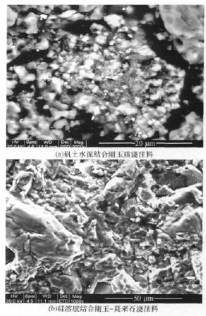 合剛玉-莫來石澆注料的SEM照片 Fig. 1 SEM photographs of bauxite cement bonded corundum castable and silicon sol bonded corundum - mullite castable fired at 1100 °C