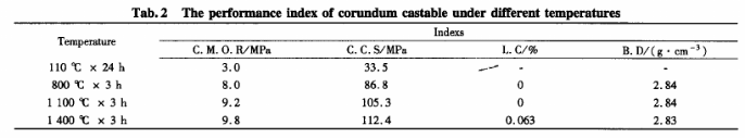 按一定的質量比稱取各相應的原料放入攪拌鍋中均勻,并分別添加適量的復合添加劑和結合劑。經試驗測定該材料的流動速度為107.8%(跳桌法),能較好的滿足材料的施工性能要求。同時通過對材料現場澆注過程的分析,我們采用相應的模擬試驗,把攪拌好的料直接放入一定溫度的40mm×40mm×160mm模具內振動成型,把成型好的試樣及其模具一起放入烘箱進行60℃×3h的烘烤后脫模,此階段相當于材料的澆注施工中,因為不斷鋪料時,材料中含自由水分的揮發,有效的降低了材料施工環境的溫度,而材料在施工完成后,水分逐漸排出,溫度開始升高,因此我們烘烤2個小時直接進行110℃烘烤,經過約2h烘烤后,材料內部自由水分基本完全排出(通過對試樣在110℃經2h、4h、6h烘烤后,測得試樣的質量在2h后變化不大,4h基本無變化),其后就對試樣分別進行815、1100和1400℃保溫3h的熱處理,相當于高爐修補后的復風。其理化指標見表2。