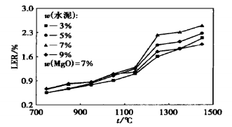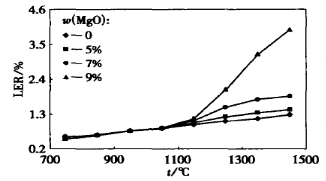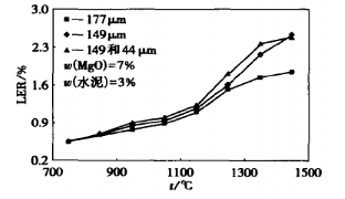 將電熔剛玉、氧化鎂、硅微粉和鋁酸鹽水泥按表2所示的配比稱量,加水7%~8%,混勻,并澆注成尺寸為Φ10mm×50mm的試樣,將成形后的試樣置于120℃下烘烤12h后,利用GP-3型高溫膨脹儀測定其在750~1450℃燒成過程中的線膨脹率LER。