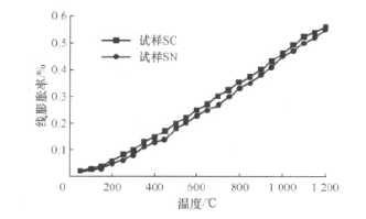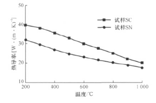 圖1比較了試樣SC和SN的線(xiàn)膨脹率,可以看出試樣SC的線(xiàn)膨脹率略高于試樣SN的。圖2比較了試樣SC和SN兩種材料的熱導(dǎo)率,可看出在600~1000℃范圍試樣SC的熱導(dǎo)率較試樣SN高約10%~25%,這對(duì)高爐中部?jī)?nèi)襯是有利的。