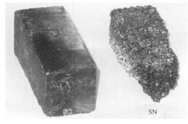 采用與GB/T14983-2008相近的試樣方法。將尺寸為25mm×25mm×70mm的試樣放入不銹鋼盒內(nèi),用無(wú)水K2CO3掩埋,在N2氣氛、930℃煅燒6h,N2氣氛下冷卻至常溫,在流動(dòng)的水槽中將試樣充分沖洗,在150℃干燥5h,測(cè)試樣侵蝕前后的質(zhì)量和尺寸的變化,試驗(yàn)結(jié)果見(jiàn)表2。圖3是熔堿侵蝕后試樣的外觀照片。可以看出;試樣SC侵蝕后棱角無(wú)缺損,表面平滑,表明K2CO3滲入材料內(nèi)部不多;而試樣SN侵蝕后棱角缺損嚴(yán)重,表面疏松,表明基質(zhì)侵蝕嚴(yán)重。所以,試樣SC表面取樣作XRD分析的結(jié)果看出,熔堿試驗(yàn)后,其物相組成與原樣基本一樣(見(jiàn)圖4),表明次試驗(yàn)條件下滲入的K2CO3少,K2CO3未與SiC發(fā)生明顯反應(yīng)。而試樣SN中的Si3N4與K2CO3發(fā)生了明顯反應(yīng)。而試樣SN中的Si3N4與K2CO3發(fā)生了明顯反應(yīng),生成低熔點(diǎn)的偏硅酸鉀和二硅酸鉀,使材料基質(zhì)遭受?chē)?yán)重破壞。