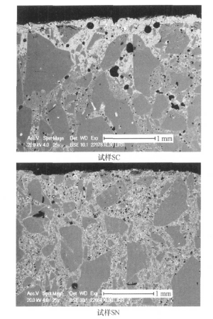 圖5為抗渣試驗(yàn)后試樣外觀照片。可以看出,肉眼觀察試樣SC和SN未見(jiàn)侵蝕,試樣SC表面附著很薄的一層渣,試樣SN表面的掛渣略多。圖6為試樣靠近渣面的SEM照片。可以看出,試樣SC表面輕微滲透,內(nèi)部與表面基質(zhì)均勻:試樣SN表面約為1mm的熔渣滲透層。