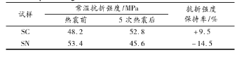 將25mm×25mm×150mm的試樣在常溫下快速置入1350℃電爐內(nèi),保溫20min后迅速取出風(fēng)冷,強(qiáng)制風(fēng)冷至常溫,循環(huán)5次,測(cè)試試樣熱震前后的常溫抗折強(qiáng)度,比較不同試樣的抗折強(qiáng)度保持率,結(jié)果見(jiàn)表3。從結(jié)果看,風(fēng)冷熱震后,試樣SC的抗折強(qiáng)度保持率為正,而試樣SN為負(fù),表明試樣SC的抗熱震性能更優(yōu)。