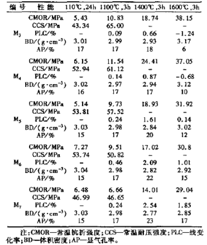 采用相同的骨料,改變細粉組成進行試驗。鎂砂細粉含量(試樣編號)分別為3a(M3)、4a(M4)、5a(M5)、6a(M6)、7a(M7),白剛玉細粉作相應的調整。骨料與基質的比例為7:3。攪拌好后,制成40mm×40mm×160mm的試樣,室溫下養護24h后脫模,測定110℃,24h、1100℃,3h、1400℃,3h和1600℃,3h熱處理后試樣體積密度、顯氣孔率、線變化率、常溫耐壓強度及常溫抗折強度。