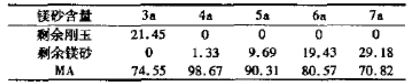 表4為試樣的基質中鎂砂細粉與剛玉細粉完全反應生成理論尖晶石基質的成分。可見,鎂砂細粉含量為3a、4a時,因基質中鎂砂細粉與剛玉細粉在1400℃左右已經反應完全,故在更高溫度下僅為燒結收縮起作用,在1600℃燒后呈現收縮;而M5、M6、M7在以后的溫度下剩余的鎂砂細粉仍然與骨料中的剛玉發生反應,繼續產生膨脹,抵消了部分燒結收縮而呈現處或多或少的膨脹,隨鎂砂細粉含量增加,膨脹顯著增加。