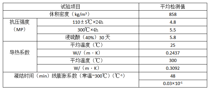 新型輕質耐酸澆注料經現場要求取原材料樣品進行性能測試,結果如下