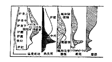 高爐在冶煉過程中,耐火材料的使用條件是很苛刻的,要承受爐內溫度變化造成的熱沖擊,爐料和高溫氣流沖刷引起的內襯磨損,氣體(CO2、O2和H2O)的氧化作用,鐵水、堿金屬、貴金屬(Zn和Pb)和渣的侵蝕等,各種損毀作用見圖1。