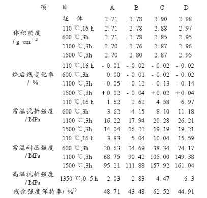 試驗中剛玉骨料為連續級配,碳化硅為<2mm的細骨料,粉料是由氧化鋁、莫來石、氧化硅微粉組成。氧化硅微粉為煙塵粉,粒度<1um,莫來石微粉<5um,氧化鋁為<4pm和<5um的粉料。在骨料中,碳化硅的加入量固定為10%,配料中骨料與粉料之比為65:35。而粉料中氧化鋁微粉與氧化硅微粉之比為2.33 ,由氧化鋁與氧化硅組成的混合料與合成莫來石料之比分別為25 :15(A),20 :15 (B),15:10(C) ,20:25(D)。其配比見表2。