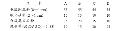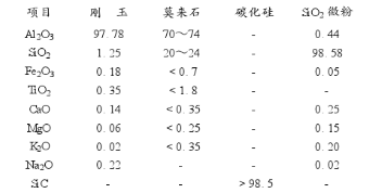 試驗所用的合成莫來石、剛玉、氧化硅微粉和碳化硅的化學組成列于表1。