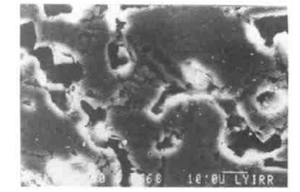采用SEM研究發現,澆注料基質中柱狀莫來石連成一片一片的網狀結構(見圖1),而莫來石的晶間由玻璃相填充。剛玉骨料顆粒與基質中的SiO2反應,在剛玉顆粒周邊形成新生的二次莫來石反應環帶(見圖2)。而碳化硅顆粒邊緣清晰整齊,但顆粒周邊有一層富Si殼層,參差不齊的富Si層與基質中的玻璃相反應結合為一體(見圖3)。