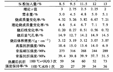 (3) 當(dāng)Si粉加入量為9.5%時(shí),材料具有較高的強(qiáng)度,較低的氣孔率,良好的熱震穩(wěn)定性以及合適的燒后線變化率。