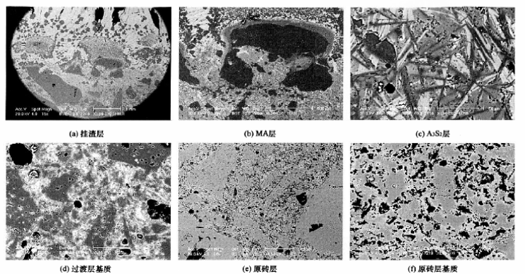 (a) MA層。如圖1(b)所示,厚度約0.8mm。該層中的剛玉顆粒被嚴(yán)重侵蝕,并在顆粒邊緣生成了一層MA;顆粒內(nèi)部的Al203則反應(yīng)生成大量的MA顆粒,這些顆粒分布于C2AS、CAS2等鈣鋁硅酸鹽低熔點(diǎn)相間。基質(zhì)已與渣中成分完全反應(yīng),生成了大量的鈣鋁硅酸鹽低熔點(diǎn)相。