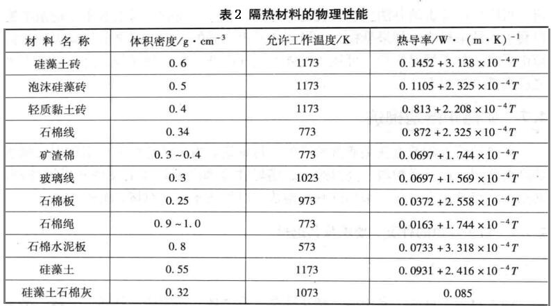 耐火材料的物理性能、力學(xué)性能見下表1。隔熱材料的物理性能見表2.