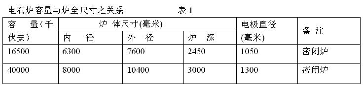 爐體的大小和電極的距離的選擇是非常重要的。當(dāng)尺寸選擇適當(dāng)?shù)臅r(shí)候,電流大部分從電極端頭流經(jīng)反應(yīng)、熔融層而達(dá)爐底。這時(shí)候電石爐的操作十分順利。否則,大量電流從一個(gè)電極經(jīng)過爐料相互擴(kuò)散層和預(yù)熱層流到另一個(gè)電極。這樣一來,電極不能深入爐內(nèi),爐底溫度降低,爐內(nèi)三相不易暢通,電石流出困難,電石爐操作惡化,對(duì)生產(chǎn)十分不利。現(xiàn)將兩種容量的電石爐爐體尺寸與容量的關(guān)系列于表1中。
