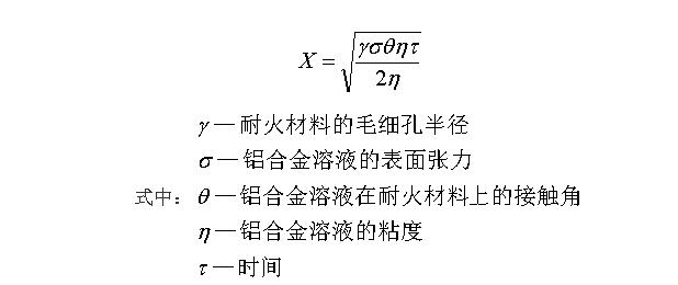 鋁合金熔煉爐襯用的耐火澆注料主要鋁合金溶液中的AL、Mg、Zn、Mn等還原性強,活潑性高的合金元素以液態或氣態的形式通過耐火澆注料內部的氣孔、裂紋、晶界向耐火澆注料內部滲透,隨之還原了耐火澆注料中的SiO2、F2O3、K2O、Na2O等氧化物,釋放金屬Si、Fe、K、Na等,使爐襯材料形成變質層,產生剝落,造成耐火材料的損毀,為此根據鋁合金溶液滲入耐火澆注料深度的近似公式: