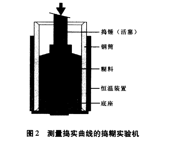 目前工業上廣泛采用以煤瀝青為粘結劑的冷搗糊,施工溫度通常在15—42℃范圍內。冷搗糊典型搗實曲線示于圖 1。測量搗實曲線目前常用的裝置是Fischer搗糊實驗機,分自動和手動。Fischer搗糊實驗機主要由搗錘 (活塞 )、鋼筒 、恒溫裝置和底座等組成 ,見圖2。