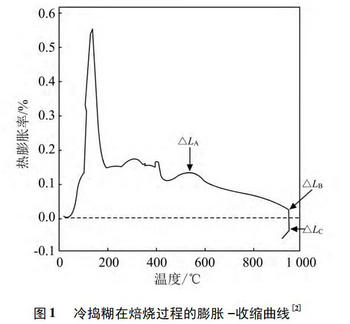 圖1是一張典型的冷搗糊燒結過程膨脹/收縮率曲線圖,為自由立式樣,升溫速度為3 ℃ /min,最高溫度為950 ℃,保溫時間為3 h。冷搗糊會因生產原料的不同膨脹/收縮率曲線也會不同,但所有冷搗糊都會經歷一個膨脹→ 收縮→二次膨脹→二次收縮→第三次膨脹的過程,這是因為冷搗糊黏結劑在焙燒過程中經歷熱解縮聚過程的必然結果。