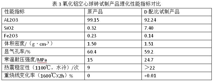 將4 種原料配比分別進行20 多次試驗,對生產出來的樣品進行理化指標檢驗,結果對比發現,試驗中按照D 配方生產出來的產品具有較高的抗熱震性能,表面光滑整潔,外形無任何缺陷,在經過高溫加熱時不易產生變形,穩定性較好,從而最終確定了這種高抗熱震性氧化鋁空心球磚的原料配比。D 配比試制產品的理化指標如表3 所示。檢測數據表明,試制產品的熱震穩定性能較好。