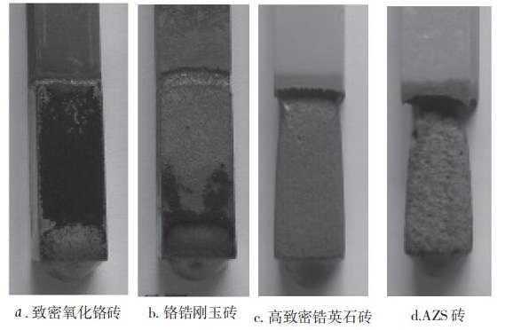 致密氧化鉻磚的抗熔融玄武巖侵蝕性最好,其次是鉻鋯剛玉磚、高致密鋯英石磚。最差的是熔鑄AZS-41 磚,其在液面線處出現(xiàn)嚴(yán)重鉆孔侵蝕現(xiàn)象。顯微結(jié)構(gòu)分析表明 :致密氧化鉻磚結(jié)構(gòu)均勻,與玄武巖熔液反應(yīng)性小,同時(shí)與玄武巖渣中的成分形成鉻尖晶石致密層阻止了渣的進(jìn)一步滲透 ;高致密鋯英石磚在高溫下鋯英石自身分解,內(nèi)部產(chǎn)生脫鋯層和玻璃相,體積變大,產(chǎn)生發(fā)泡現(xiàn)象。 電熔AZS磚的顯氣孔率雖然很低,對(duì)玄武巖熔液有較好的抗?jié)B透性,但其液相量較多,鐵離子進(jìn)入玻璃相,形成SiO2-Al2O3 -FeO結(jié)構(gòu)體,降低熔點(diǎn),加劇渣蝕。因此抗侵蝕性相對(duì)較差。對(duì)于采用電助熔的窯爐,還需考慮電極磚材質(zhì)的選擇,即要電導(dǎo)率低的又要耐侵蝕的耐火材料。