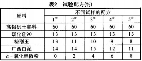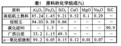 硅莫磚使用在水泥工業回轉窯上的高耐磨產品生產配料主要原料:高鋁礬土熟料,采用山西回轉窯煅燒高鋁礬土熟料;棕剛玉,硬度大、熔點高、化學性質穩定,對酸堿都有良好的抵抗性能;碳化硅,用石油焦與SiO2合成的碳化硅分解溫度高、莫氏硬度高。基于此,選擇剛玉、碳化硅強化基質,是制品獲得體積密度大、熱態強度高、耐腐蝕和耐磨等性能具備的條件。引入外加劑一氧化鋁微粉以改善產品高溫性能,結合劑選用密度為1.20~1.25g/cm 的紙漿廢液,加入量為3%-4%。所用原料的化學組成見表1。配比來確定最佳的生產工藝。先后進行了5次試驗, 試驗配方見表2