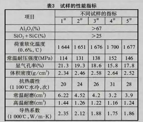 性能檢測標準按照GB/T2997—2000檢測燒成后試樣的顯氣孔率和體積密度,按照GB/T5072—1985檢測燒成后試樣的常溫耐壓強度,按照YB/T376.11-1995檢測燒成后試樣的荷重軟化開始溫度 ,按照檢測燒成后試樣的抗熱震性,耐磨試驗按照GB/T1830卜200l耐火材料常溫耐磨試驗方法進行。采用電子顯微鏡分析試樣
