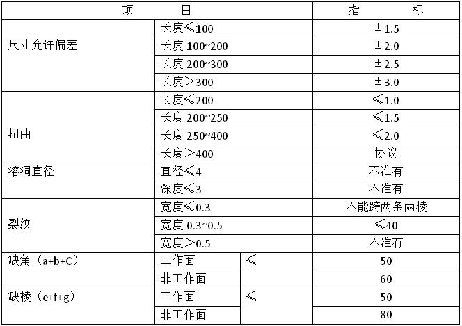 表2 氧化鋁空心球磚的尺寸允許偏差及外觀要求                    (單位為毫米)