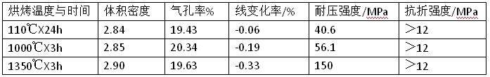 實驗中澆注料的粗粒(5~1.25mm)、中粒(1.25~0.065)mm、細粒(小于0.065mm)配比采用4:2:4,干混.0.5min,加水濕混5.5min后,測定自流值再在40mmX4mmX160mm三聯模中讓其自然流平,室溫下養護(12~18h),脫模后再養護24h,最后在烘箱中經100℃X24h烘烤,測定其物理指標。一組典型試樣指標如表
