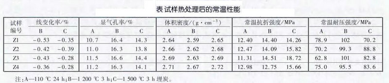 結果與討論試樣的常溫性能如下表所示。從表中可以看出1200℃3h熱處理試樣的線收縮率大于1500℃3h埋炭熱處理試樣的線收縮率;隨著鋯英石加入量的增加,試樣的線收縮率變小。將1500℃3h埋炭熱處理的試樣Z4的基質部分進行分析。