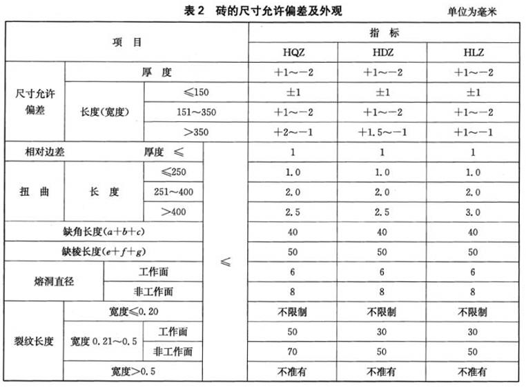 4.2磚的尺寸允許偏差及外觀應符合表2的規定。