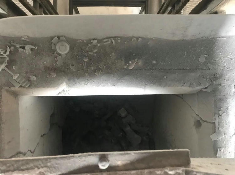③該鋁熔煉爐的投料方式是屬于半自動的,人工將鋁錠放入到提升機內,然后通過提升機將鋁錠提起到投料口,通過豎井直段進入熔煉爐內部,豎井是長方體四周使用耐火澆注料砌筑,由于使用年限長豎井內部的耐火澆注料在平時生產期間被鋁錠及熱沖擊已經破壞出比較大也比較多的橫向縱向裂紋,已經不能使用。