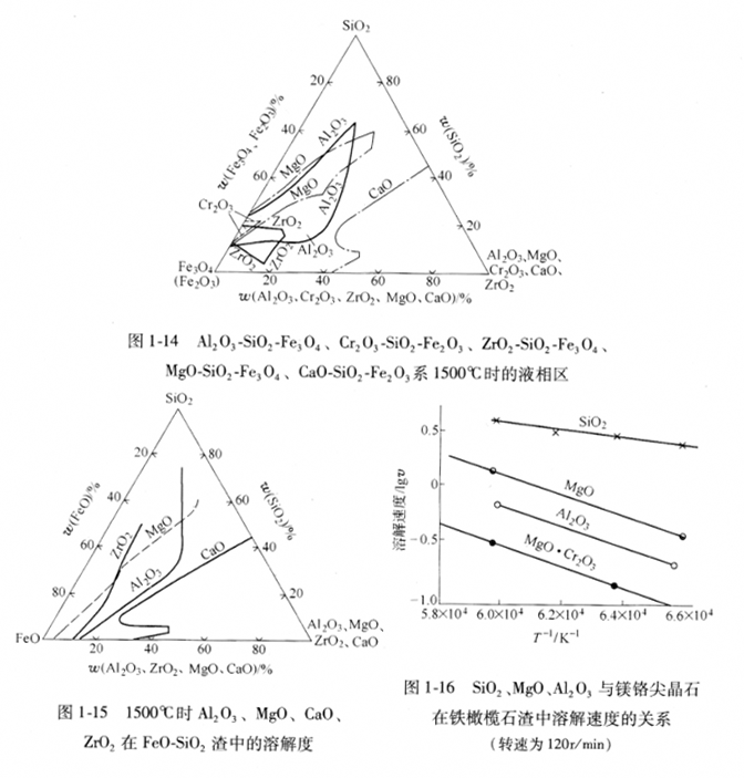 由圖1-14、圖1-15、圖1-16可見,CaO與鐵硅系渣形成的液相區最大,在鐵硅系渣中的溶解度最高;而Cr2O3、ZrO2與鐵硅系渣形成的液相區最小,在鐵硅系渣中的溶解度也最小。這表明:CaO質與含CaO多的白云石質材料抗鐵硅系渣侵蝕性差,不適于用作銅冶煉耐火材料。Cr2O3質、ZrO2質或含Cr2O3、 ZrO2的耐火材料抗鐵硅系渣侵蝕性好。