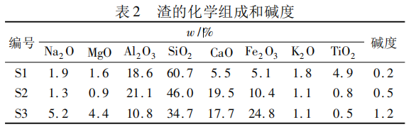 試驗用耐火材料為市售鎂尖晶石磚和鉻剛玉磚,試驗用渣為危廢焚燒處理后的3種尾渣,分別標記為在 950 ℃空氣氣氛中預處理后使用,其化學組成和堿度m(Na2O+K2O+CaO+MgO+Fe2O3)÷ m(SiO2+Al2O3+TiO2)見表2。