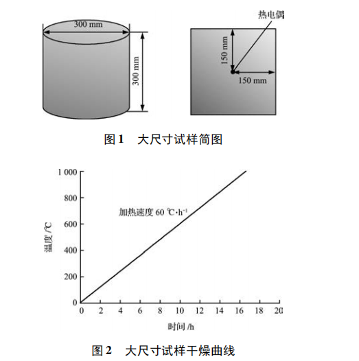 試樣的簡圖示于圖 1 1 所示試樣的尺寸是Φ300 mm × 300 mm熱電偶置于150 mm × 150 mm中心位置,混煉好的澆注料進行澆注,養生 24 h。如圖2所示,脫模后以 60 ℃ / h 的速度加熱到1 000 ℃。根據所獲得的試樣內部溫度曲線對干燥特性進行了評價