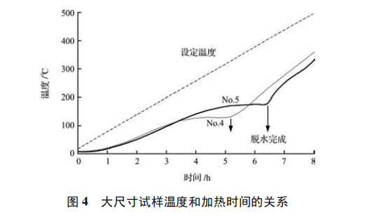 No.5 試樣透氣率有所提高,為了比較,對 No.4試樣進行了干燥試驗所獲得的試樣內部溫度曲線示于圖 4。對應設定溫度,No.4 試樣和 No.5 試樣幾乎都是按照相同的速度持續升溫,但是 No.4 試樣在 130 ℃附近升溫速度放緩,推測最大蒸汽壓力大約是0.3 MPa No.5 試樣是在180 ℃放緩推測蒸汽壓力大約是 1.0 MPa。另外從拐點位置算起,No.4 試樣的脫水完成時間比 No.5 試樣快 1.3 h 左右。由圖可知,No.4 試樣尺寸大、透氣率高、內部蒸汽壓力沒有提高,干燥結束時間也早。