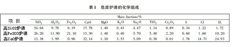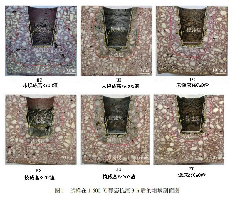 鉻剛玉澆注料是重要的危廢焚燒爐爐襯材料之一,但危廢來源廣泛,成分復(fù)雜,導(dǎo)致爐渣的成分存在差異,從而影響爐襯的使用壽命。以鋁酸鈣水泥結(jié)合鉻剛玉澆注料為對象,選取了富含CaO、Fe2O3和SiO2的三種典型危廢爐渣,試驗了對鉻剛玉澆注料燒成前后的侵蝕/滲透行為影響。