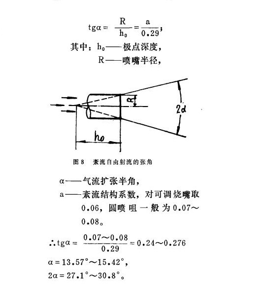 采用擴張型燒嘴磚作為延伸段具有使軸向和切向速度峰值之間徑向隔開距離加大,并使反向質量流量加大的綜合影響,所以平焰燒嘴磚推薦長度L=1~2d,其中d是噴管喉部直徑,氣流擴散角θ大于100°很容易向徑向展開,形成平展氣流,而半徑R=0.8~2.0D范圍內都能形成平焰。用中壓空氣做旋轉流體帶動直噴口噴出的低壓焦爐煤氣的平焰燃燒器,對喇叭口曲率半徑R=0.7~3.5D14個燒嘴磚進行試驗,結果表明都能形成平面火焰。但當R=0.7D時較困難,它需要足夠大的旋流強度和火道深度。R=1.0~2.0D容易形成平焰,而R=1.1~1.5D時氣流附壁性最好,火焰直徑很大。R2.0D時火焰直徑減小向燒嘴磚內移動,R=0即張角為180°時不能形成平面火焰。