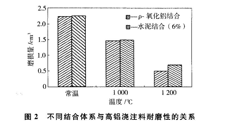 為了進一步比較低水泥結合和無水泥結合高鋁澆注料的高溫耐磨性能,選用微粉代替 Secar71水泥(加入量為6%)作結合劑進行了高溫耐磨性試驗。圖2為不同結合體系與高鋁澆注料高溫耐磨性的關系。由圖2可看出,材料在各試驗溫度下的耐磨性差別較小,但在高溫(1200)條件下,無水泥澆注料的耐磨性稍好一些。這可能是由于ρ-AL2O3微粉結合的高鋁質澆注料在1200℃時產生的玻璃相相對較少,從而使其具有較高的強度。
